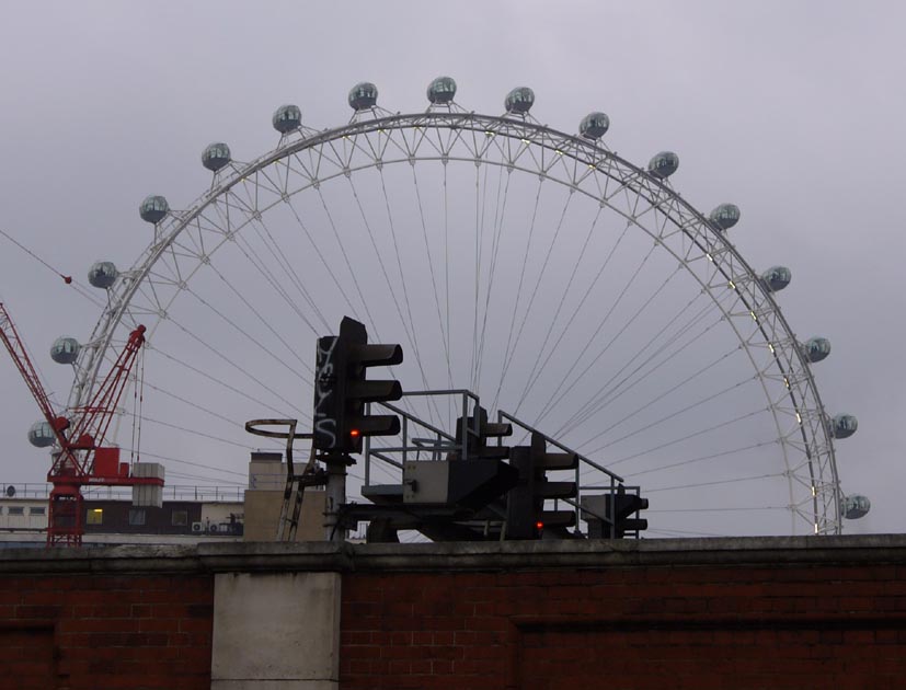 Yesterday I was out and about, seeking cheap classical CDs, which are getting cheaper all the time. You can get really good ones now in London for less than a single tube ticket. So there I was, just past Waterloo Station, just beyond the Wheel, and as usual I noticed how cute the views can look when the Wheel rises up in the background (1.1, 1.3). Straight views of the Wheel and nothing else are everywhere, but there are still views of it to be snapped and pondered when combined with other things, like trees or signals, or, a favourite with me, cranes.