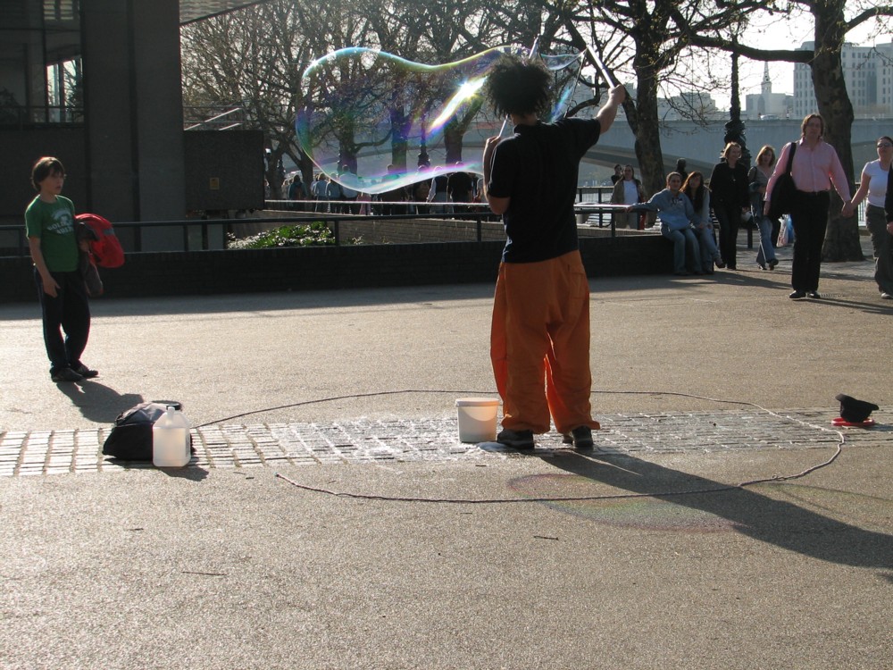 By way of celebration of the fact that West Ham won today, away, against Arsenal, here’s a quota photo taken two days ago of a man who blows bubbles for a living, outside the National Theatre: