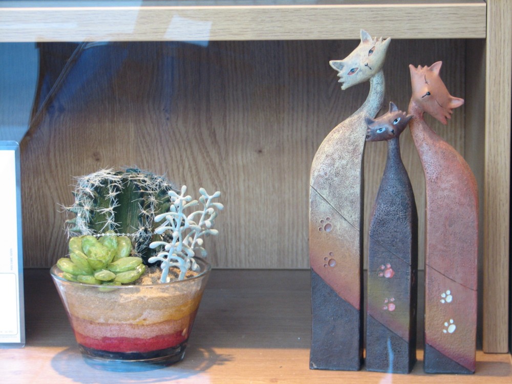 So, on the right there is a quota photo of three of my favourite local cats. They have, for many months now, and maybe even for years, been in the window of Rymans, at the lower end of Victoria Street, a bit further up from the million pound front door of the Department of Trade and Industry or whatever that’s called now, on the left as you walk away from Parliament Square and Westminster Abbey. They are, I believe, for putting pens and pencils in. Click on them to get them and the cactus bowl that has been next to them, also for as long as I can remember.