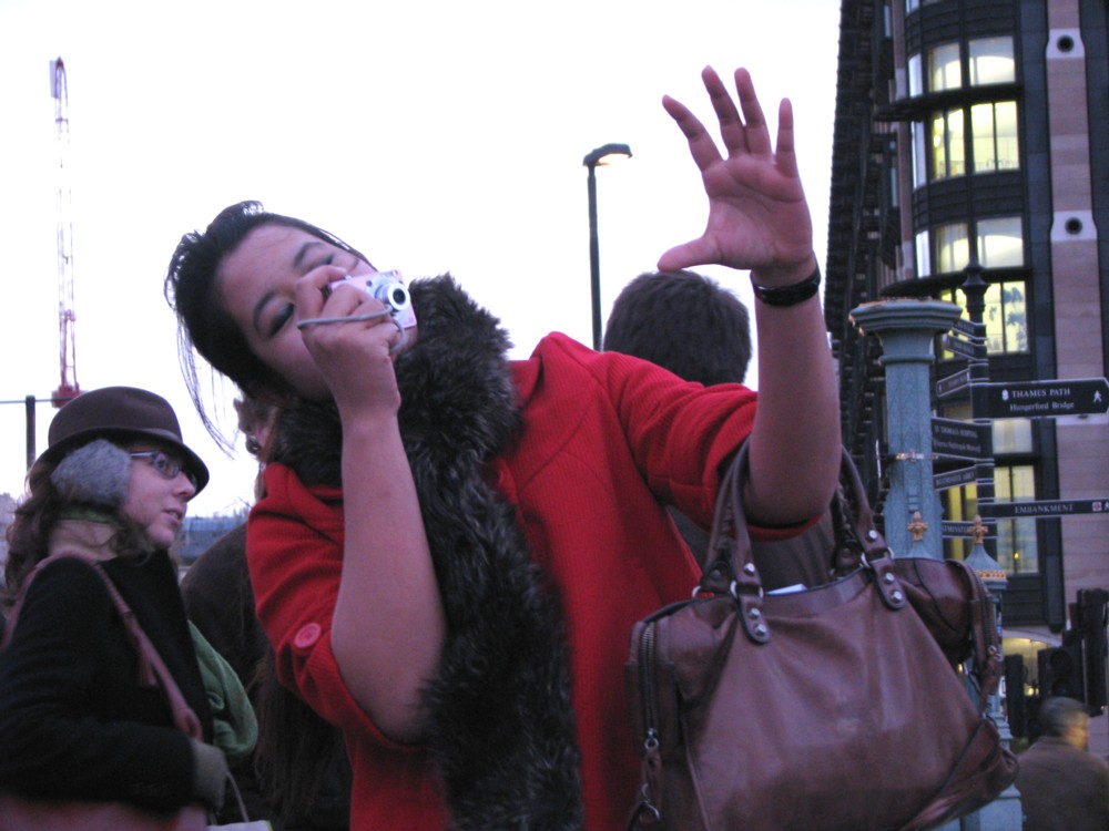 Taken last Wednesday on the South Bank, between the Wheel and the Hungerford Bridges. This is where strange people stand motionless in strange painted costumes, all silver, or all yellow, of invisible, or dressed as a pirate or a Chinese lady dancer or some such. He’s photo-ing one of these, so that he gets the Wheel right behind them.