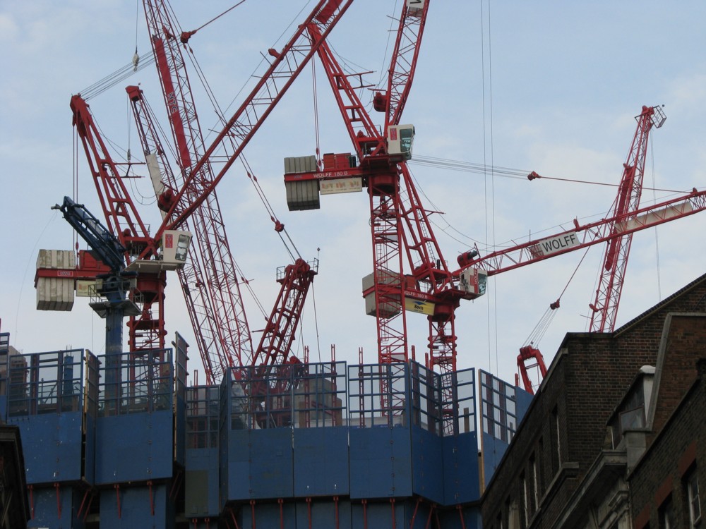 I love to photo crane clusters, the ultimate in unselfconscious aerial urban clutter. And today I encountered a beauty, just to the south east of Centre Point, which is at the junction of Oxford Street and Tottenham Court Road. They’re building the inevitable agglomeration of shops, hotels, offices, flats, whatever, and I’m sure when it’s finished it will be impeccably dull. But meanwhile, it looks like this!:
