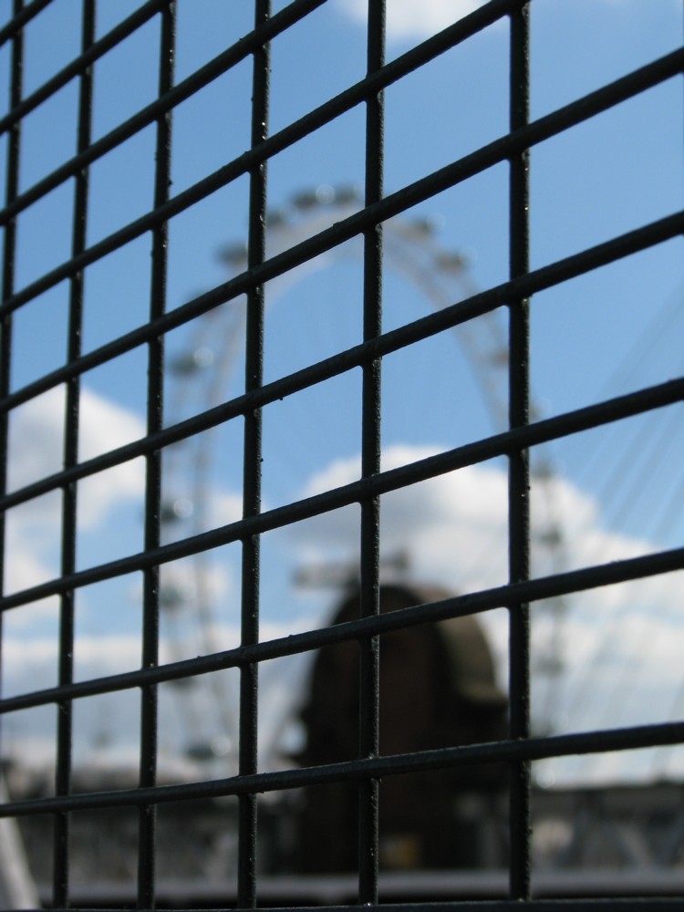 This is strictly one of those “well I like it” postings, and, well, I do like it. I do love that Wheel, and can never not snap it whenever I look up and see it, somewhere or other, and especially if peculiar and weird things are in the foreground, or just generally in the shot. This time where I am is on the down river Hungerford footbridge, looking through the side of the old railway bridge which is now in between the two new footbridges.