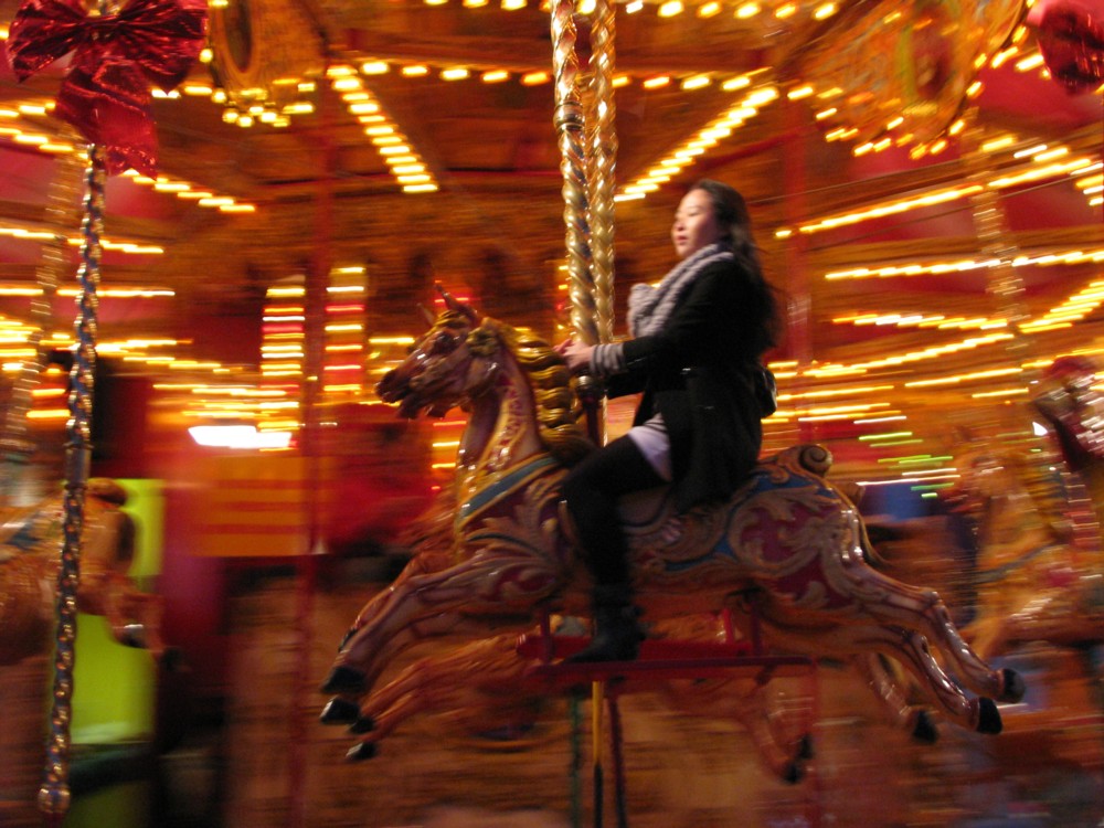 Anyway, if only to soothe D Davis, over there and clickable-on is one of my more fondly remembered snaps of last year, taken on November 30th in Leicester Square, where they have a funfair every year. Also, snapped at one of my favourite times of day, when it’s just getting dark, and anything that moves can be relied upon to be blurry. Even the horsewoman is a bit blurry, which is maybe just as well (recognisability etc.), but I still like it.