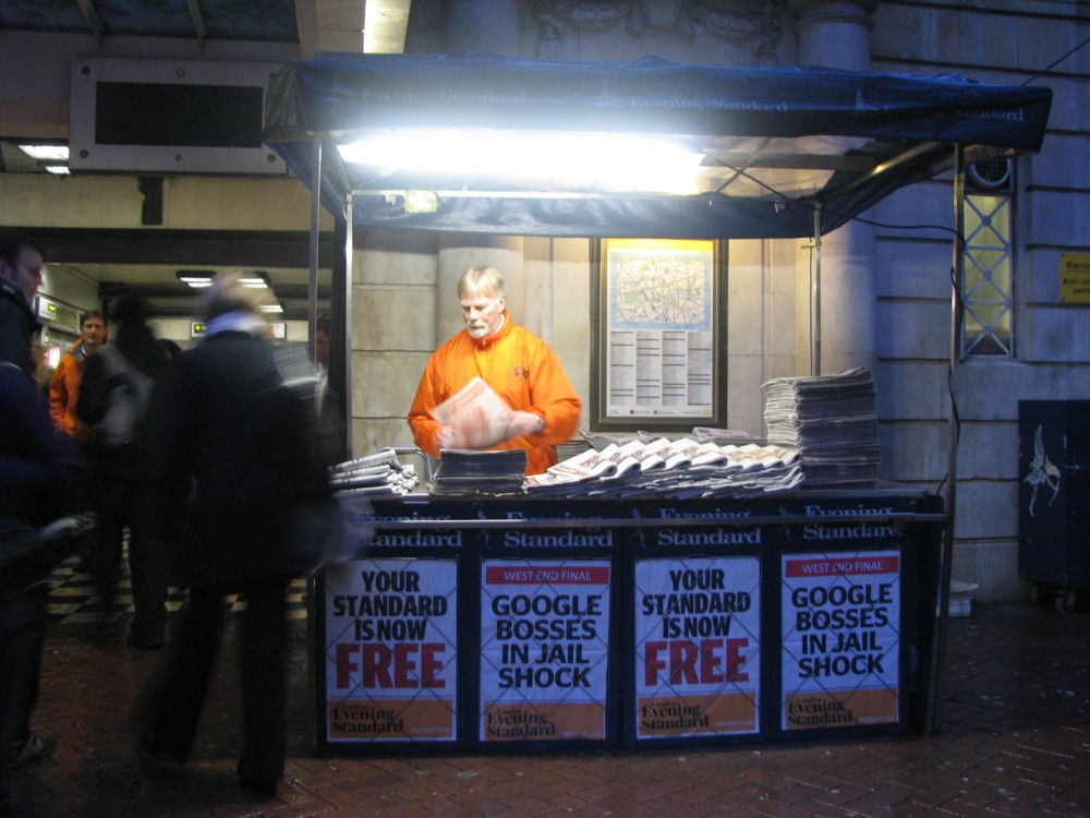 So, the Evening Standard is still doing headline billboards, in a few places, if not in nearly so many as before it went free. If you click on the October 20th picture, you’ll see that same guy, in the same spot.