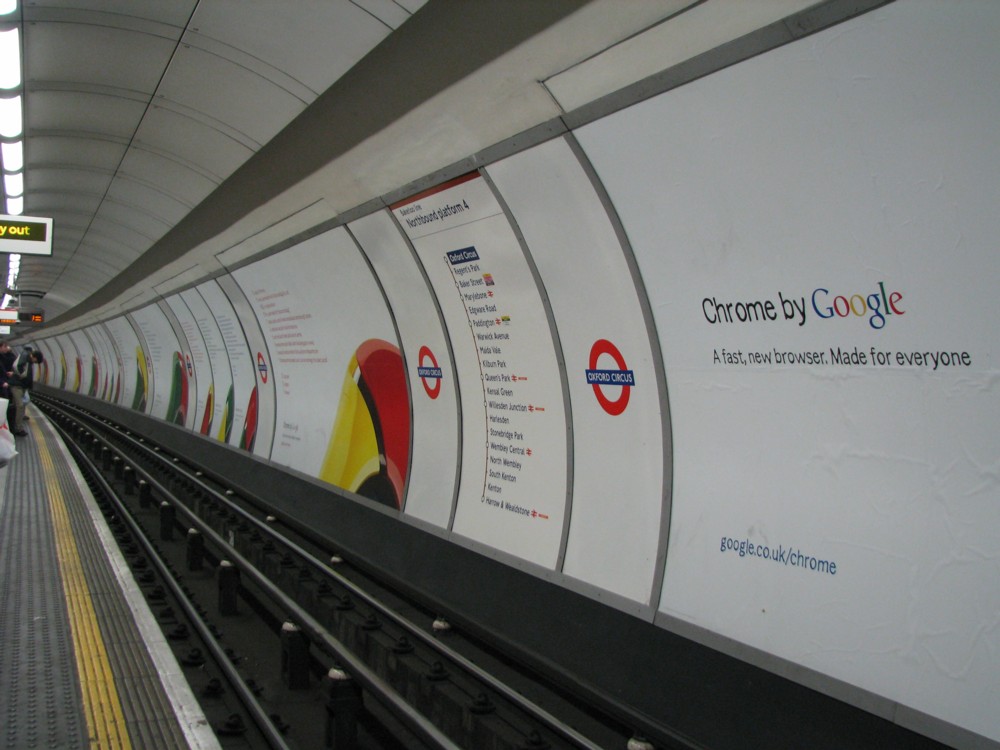 2009 culminated, in London, in a huge flood of adverts for Google’s Chrome operating system. One of the Oxford Circus platforms that I photoed on December 30th had nothing but Google adverts: