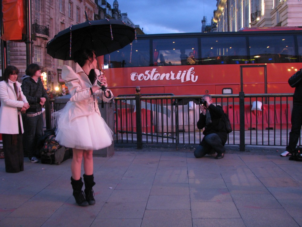 That was last Saturday, I think, at Picadilly Circus, definitely. I took lots of this particular little drama. I figure, if they put on a great big show like that, I’m entitled to snap it too. I did, anyway. And if you take lots of pictures of a real photographer in action, in bad light, sooner or later your opinion about the best time to take the snap coincides exactly with his and you get what I got.