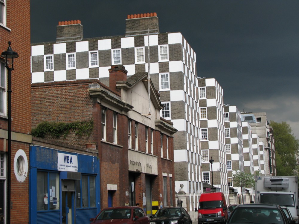 This afternoon was sunny, but then it turned grim and rainy. I happened to venture out just at that moment of meteorological transition, and so got to see, and to photo, one of my favourite lighting effects, which is when the ground or the buildings on the ground are lit up by the sun like on a regular sunny day, but behind the brightly lit stuff on the ground is the near-black rain filled sky. This can seriously change the rules about what looks good. Normally this clutch of council housing is not that great to photo, but today, it looked something else again: