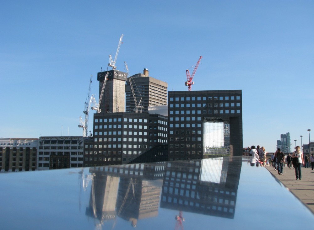Although this photo contains no digital photographers it is otherwise perfect. There is a Big Thing. There is reflection. There is foreground clutter, in the form of cluttery old buildings and in the form of scaffolding. The Big Thing, like the scaffolding (and one of the reasons why I like that also) is in a temporary state, which means that the photo records of a moment that will soon pass, unlike a photo of the final version.