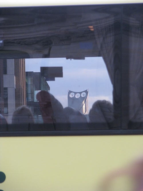 Indeed. That is indeed, on the left, a bus. We’re looking through two of its windows, from outside St Paul’s Cathedral (bits of which you can see reflected), across the river to where the Strata tower, aka “The Razor”, is to be seen, above and beyond Tate Modern: