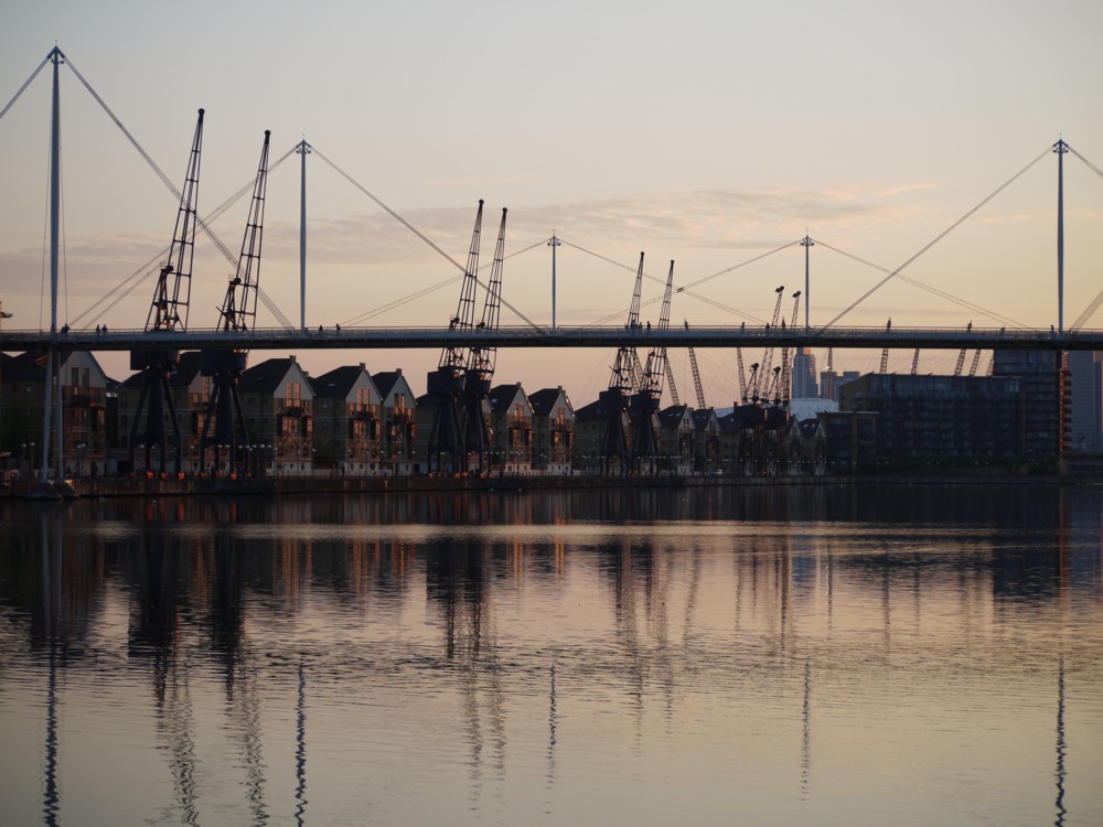 For ages now I have been wondering how exactly to blog some more about the big and rather beautiful footbridge that goes north south across the Royal Victoria Dock. Well, here are a couple of pictures of this bridge, taken by me from the north side of the Dock, looking back towards the Docklands Towers, the Dome, and central(er) London generally.