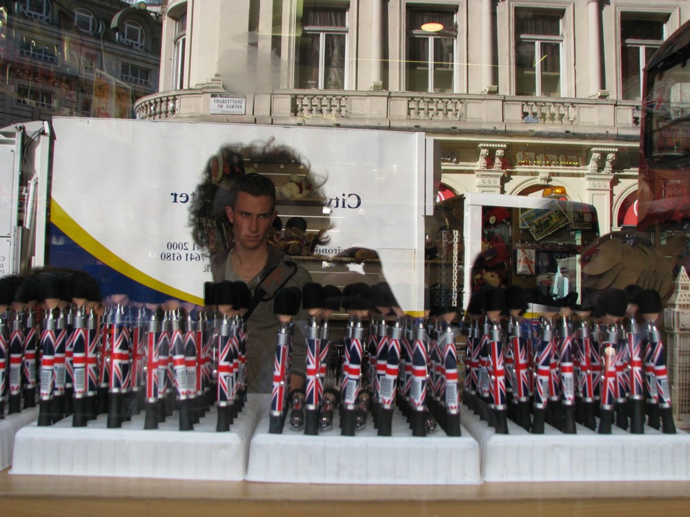 I’m standing in Shaftesbury Avenue, photoing tourist crap through the window of a tourist crap shop, which is something I like to do. I like the repetition of it when it’s all there lined up like soldiers (in this case very like soldiers), in the shop, and I like that I can enjoy a really quite large job lot of the crap without having paid for any of it.