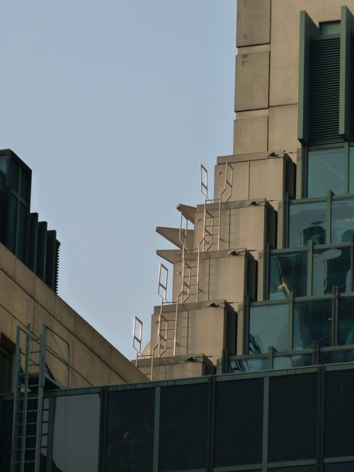 So, for instance, I saw some weird looking flyswapper thingies on the top of the MI6 Building, sparkling away in the sunshine at the outer limit of my field of effective vision, when on my way to Vauxhall Station the other night. I supposed them to be some kind of magical telecommunicational devices. I photoed them, only to discover just now, perusing the snaps of them at home, the much more prosaic reality.
