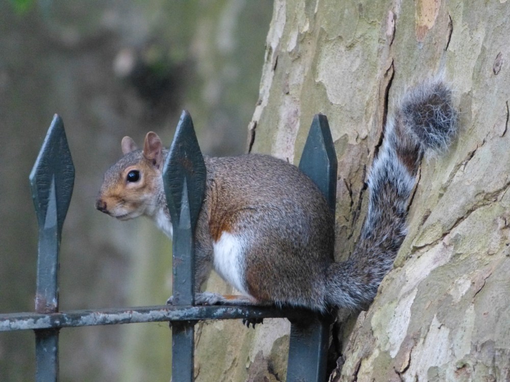 Squirrels make good photographic prey. They run about, thereby attracting your attention. Then they stand absolutely still, while you take the photo. In London, they are tame and do not mind being only about two yards away from you. Timid squirrels used to avoid being eaten, and thus dominated the squirrel gene pool. Now timid squirrels miss out on eating stuff themselves. Evolution in action.