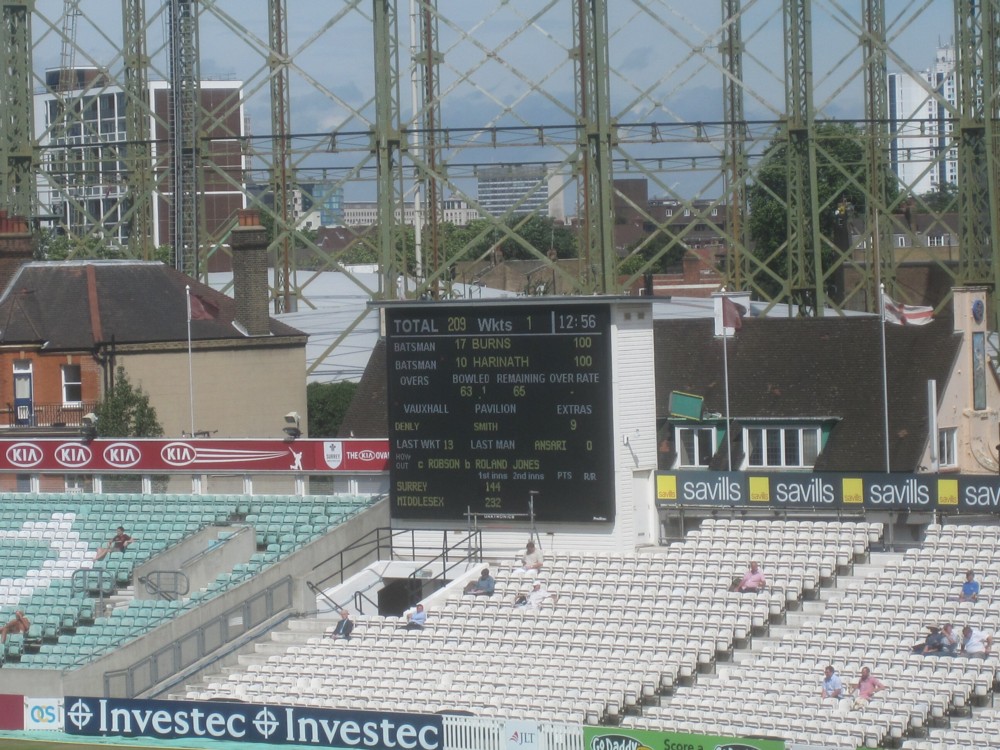 Darren Hopkinson, responding to this earlier posting about the fortunes (and misfortunes) of Surrey County Cricket Club, said he had a photo of the scoreboard at the same time I did a Cricinfo screen capture, both of us capturing what may prove to be the pivotal achievement of Surrey’s season. Would I like a copy? Yes I would.