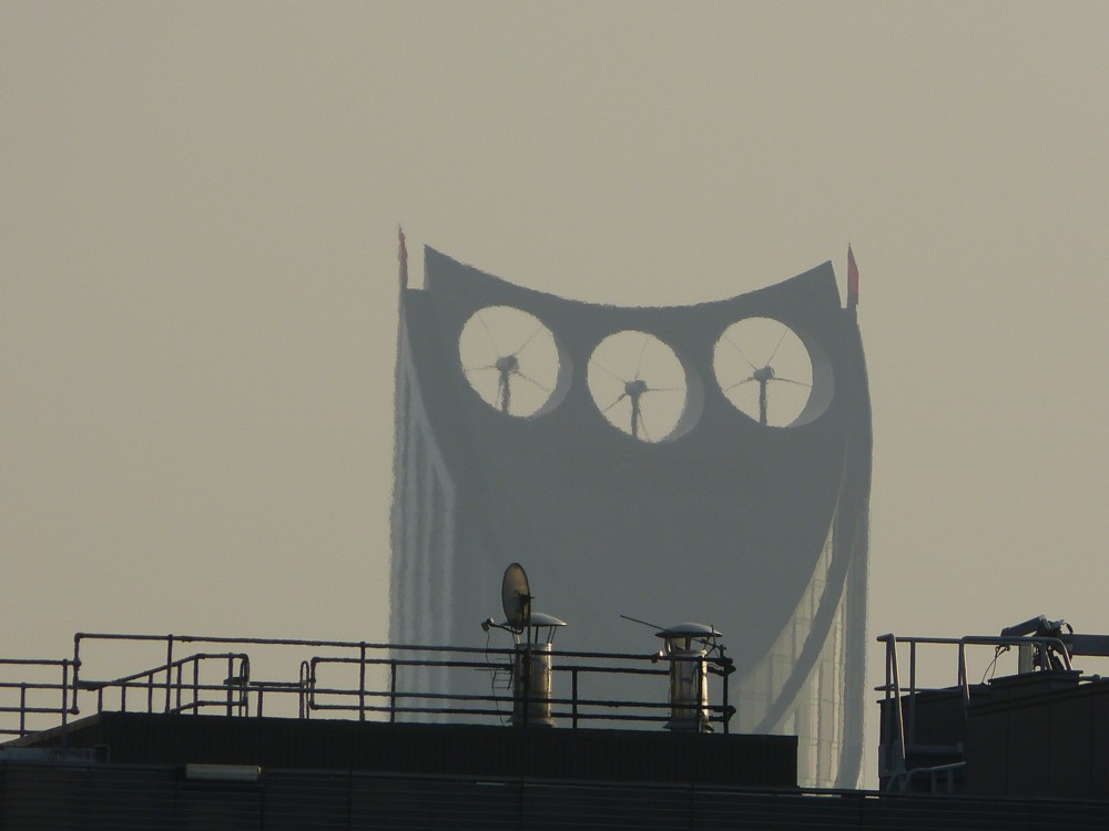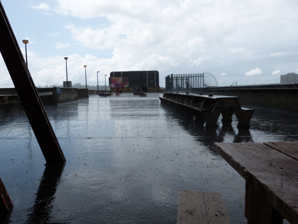 Finally, a couple of snaps taken at the top. On the left, another of the rain, and of what the rest of the roof not occuped by Frank’s Cafe looks like. On the right, on another bit of the roof, a very strange state of affairs.