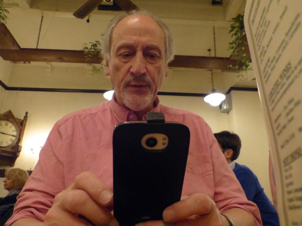 I met up with Tony on Sunday evening, and we dined out, very well. Thanks to my twiddly screen, I was able to take photos of him like this, with the camera resting in the middle of the table, and me just looking down at it: