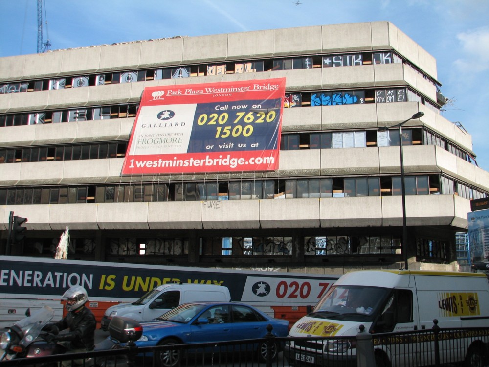 This Thing was situated in the roundabout on the far side of Westminster Bridge, now occupied by the big hotel featured in picture 1.3 below. Someone told me a few days back, when I was talking about having posted an earlier picture of it here, that it was a G(reater) L(ondon) C(council) office annex, reached by a tunnel under the road from the main building. So, now that London’s local politicians have moved downstream, to The Testicle, this Thing became superfluous to requirements.