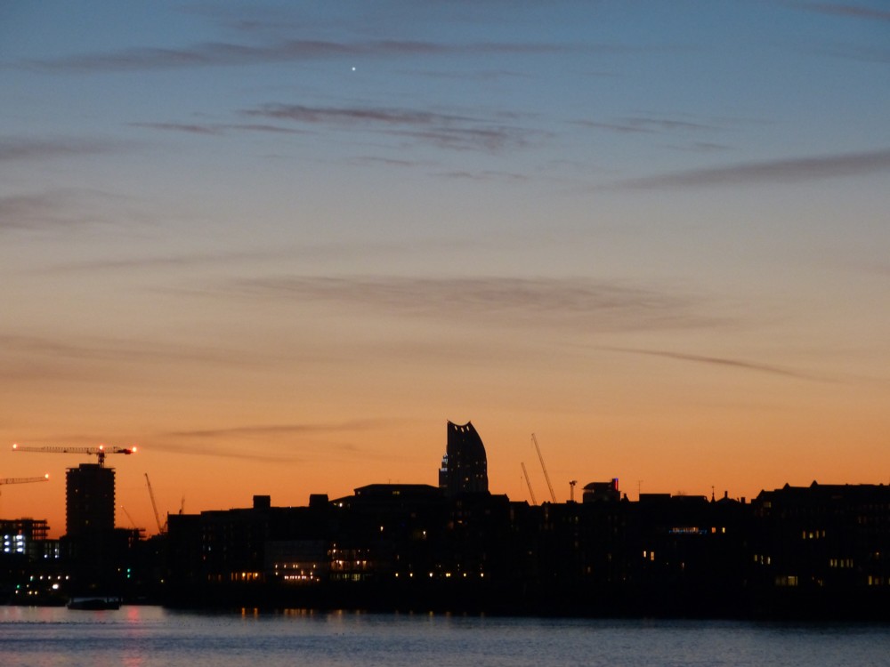 While weaving my way along the river bank, I was delighted by how many Big Things came into view at various times during my journey. In that picture you can see the Cheesegrater, the Gerkin and the Shard, as well as, on the right in the foreground, the big Battersea Tower which I want everyone to call the Spraycan. At various other times, I espied the Strata and the Walkie Talkie, the latter being visible only minutes before I took the above shot. But the pictures I took which included the Walkie Talkie said less about the general ambience of the riverside, so I went with this one.