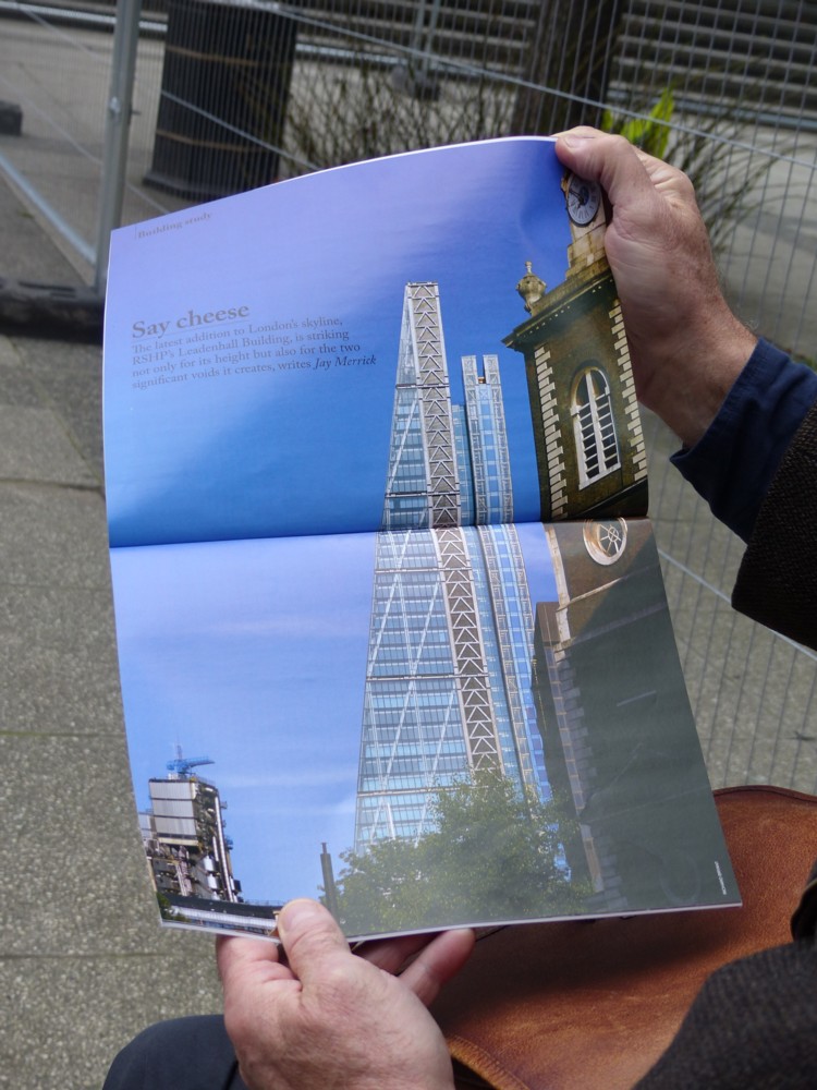 On the left, Gus shows me a magazine picture of the Cheesegrater, taken on a much nicer day than the day, cold and windy, that we were having to put up with today. Next in line is one of those Big Things seen through a gap in the foreground shots, but with a difference. This time, there are two Big Things involved. There is a sliver of Walkie-Talkie on the right, and then way beyond it, you can see the Shard. Then, we see Gus joke-propping-up the miniature Lego Gherkin that is to be seen next to the regular Gherkin. On the right, Gus looks up at something or other, this being the best snap I did of him.