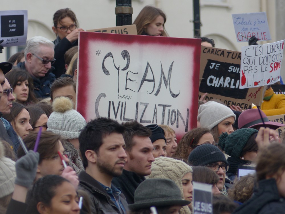 Of all of these, my two favourites are “Team Civilization”, and “Down With The Tyranny of The Offended” (in French). But demos are at least as much about quantity as quality, and I trust the sheer number of signs shown here (there were plenty more that I didn’t get to photo) makes the bigger point. There were a lot of people turning out to denounce these horrible attacks.