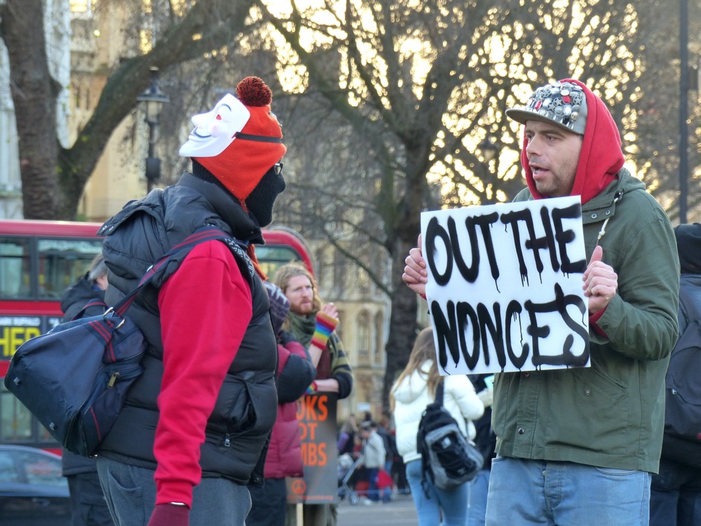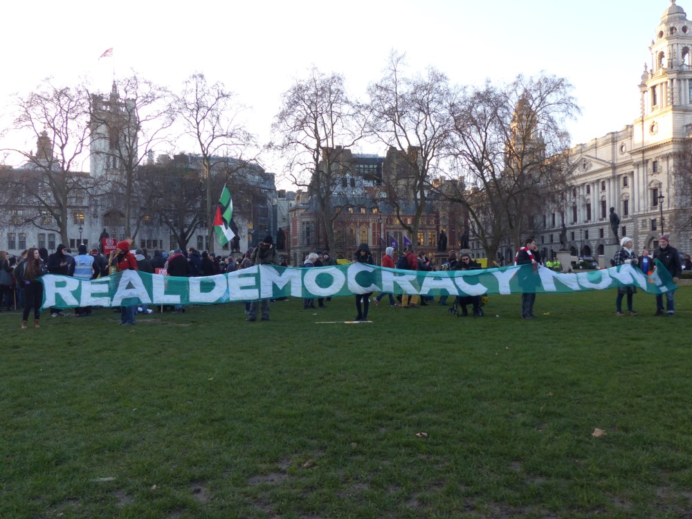 Even the rather or almost completely illegible signs are an encouragement, I think, because what these signs tell us is that quite a few people were present, and feeling strongly enough about it to want to wave a sign, who had never been anywhere near such a demo ever before.