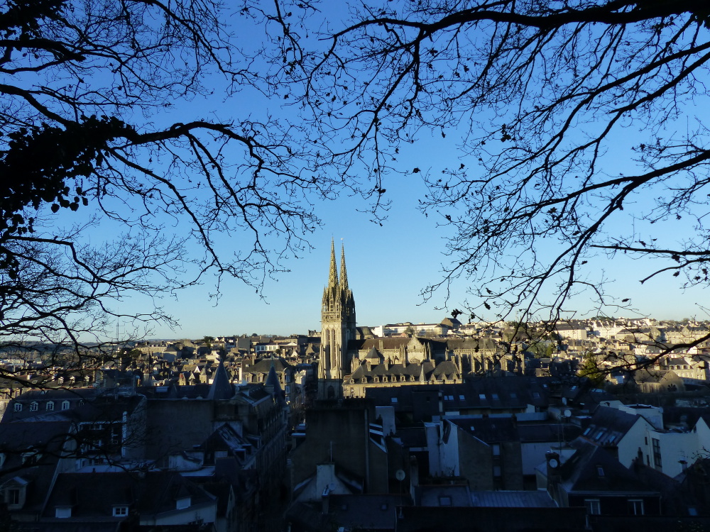 I have tried this before, but have only previously been here in the summer, when the trees are all smothered in foliage. I had been thinking about this since before I came here this time around. This time around, I thought, I might be able to really see Quimper and its Cathedral properly, with branches and twigs intervening somewhat and rather decoratively, but with no leaves to spoil the view. I earlier photographed the Cathedral in gaps between the leaves, but this time I wanted to get both the Cathedral, and its place in the entirety of Quimper.