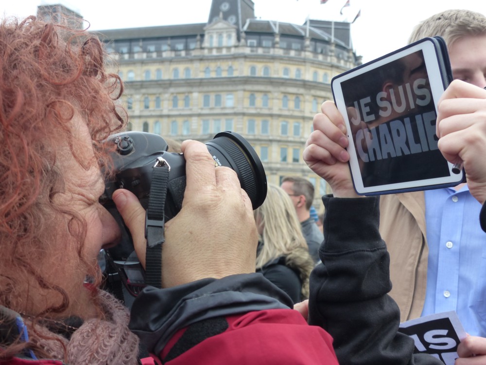There were, of course, lots of signs (including many mobile phones and at least one tablet) saying “I AM CHARLIE”, in fact you can see quite a few such if you do some clicking. But, here are all the signs I photographed that said something else as well, or instead:
