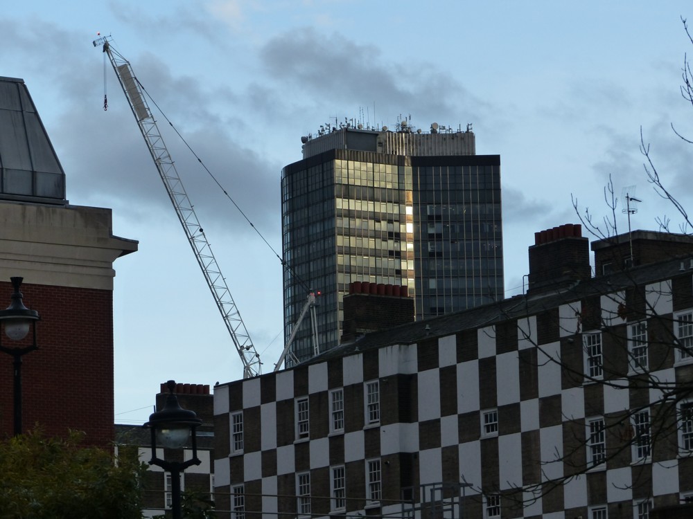 Not as pretty a foreground is it might have been, and must have been for many others who were out and about in London at that time, or who were told to get out and about by others. But: cranes, scaffolding, a tree with no leaves cluttering it up, that chess board building I like, the Millbank Tower and its classic roof clutter (see the right hand one of these photos). I wasn’t complaining:
