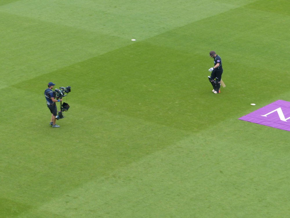 That’s Gary Wilson of Surrey striding off at the end of the Surrey innings (they batted first), doing a great job of pretending that the TV guy who is poking his huge camera in his face just isn’t there.