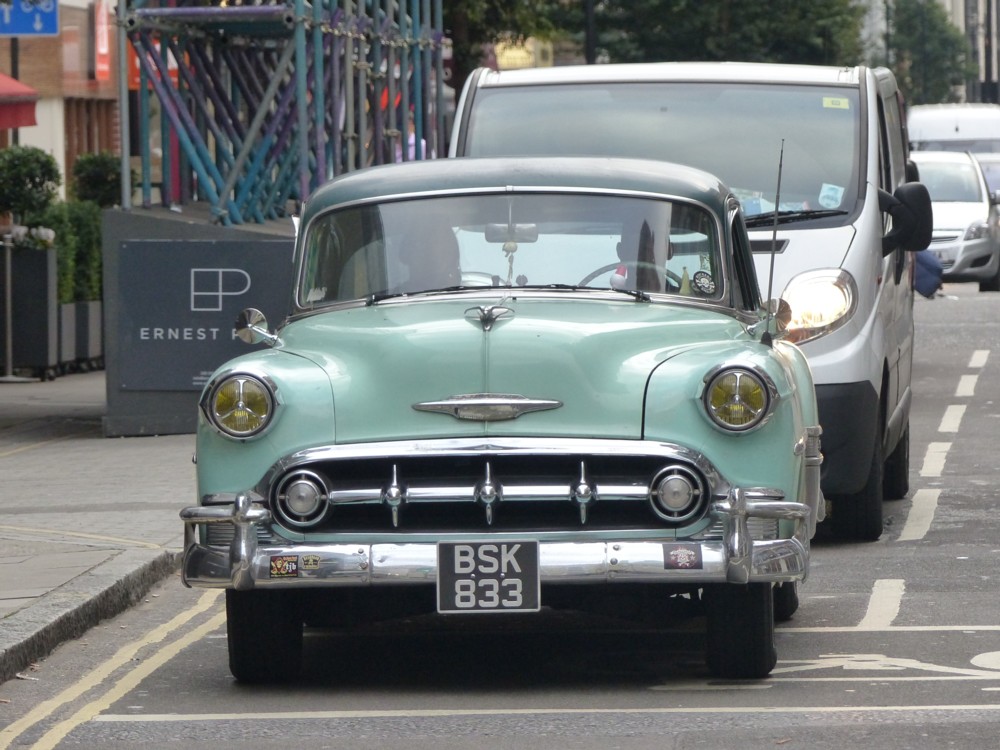 I don’t know what brand of car this is. It looks very American, but Brit cars of those times were very American-influenced. (Now the influence seems to go more the other way, from Europe to America. Or maybe it’s just everyone being influenced by Japan.) What settles it, for me, is (see the first two pictures) that the car is left hand drive. Got to be American. But what variety of American?