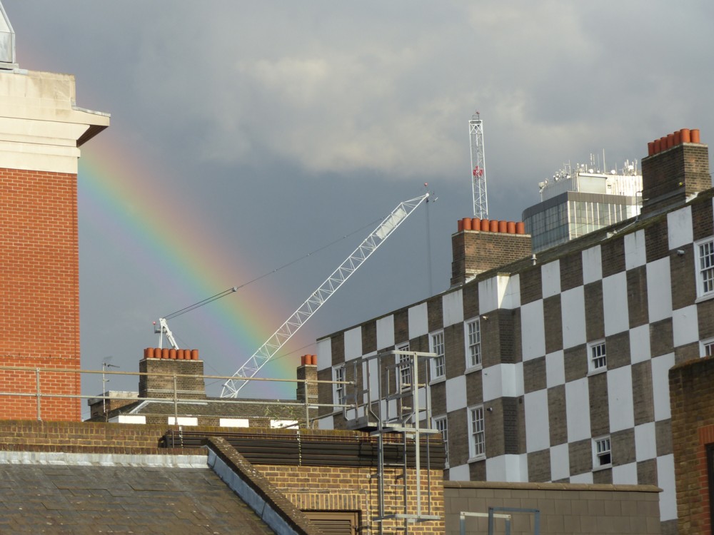 Just under a week ago, last Wednesday, there was rainbow weather over London. I was in my local laundrette, which is just at the corner where Horseferry Road stops going at a right angle to the river and does a sharp right towards Victoria Street. But even thought I was lugging a big bag of shirts with me, I followed my camera rule, which goes: always have it on me. Consequently, I had my camera on me, and was able to take photos.