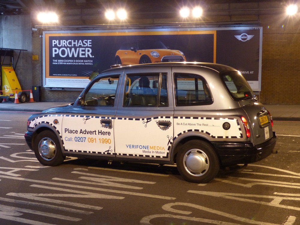 I’ve been photoing a lot of taxis-covered-in-adverts lately, and this is one of my recent favorites, both because if came out so well in such discouraging light (my camera is not called “Lumix” for nothing) and because it is of that generic thing, an advert for adverts. You want to stick an advert on your taxi. This is who to contact: