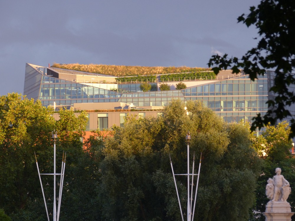 But the one on the left is really nice because the lady with the matching pink iPhone case and pink spectacle frames is photoing one of those little assemblages of modern architecture of the sort I especially like. There are all those apartments across the bridge approach from where James Bond’s bosses live, and to the right of these apartments (which already look rather tatty from close up but which look much better from afar) we observe the Spraycan. The Spraycan will soon, I believe, be joined by other towers, as that whole part of town erupts with activity sparked by the new US Embassy a bit further up river.