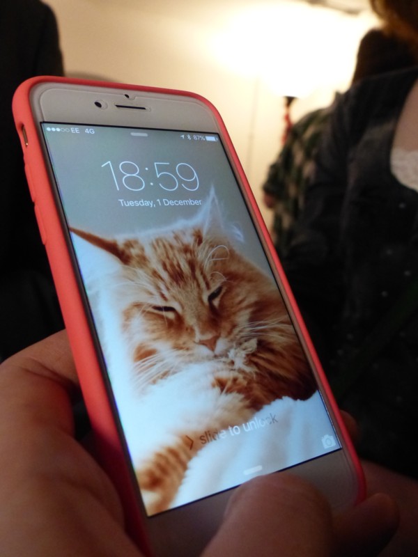Me carrying a camera caused her to mention that she too was keen on photography. I asked her what is the best photo you’ve ever taken? And she said, tapping away at her iPhone: probably one of these. Definitely a cat person. I reckoned it a bit too uncouth to be photoing her, but I did photo her iPhone, which is also good when the light is a bit dodgy, as it was that evening.