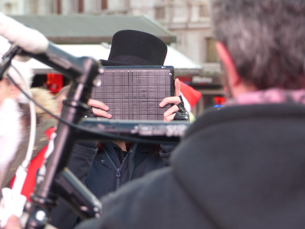 The total amount of anonymity supplied to these two dudes is about right, but is, unfortunately, rather unevenly distributed. Dude 1 on the left is not showing us his screen, but I do like how I used that lamppost to prevent any machine from being able to spot him. Although, we can all see where the photo was taken, thanks to that road sign, which I also like including in photos.