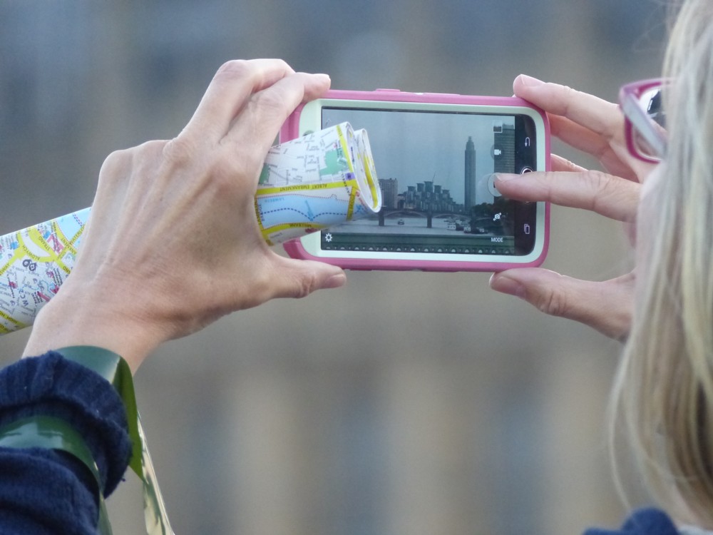 And, she is holding a map. Does she not know that she could whistle up a map on the phone she is photoing with?