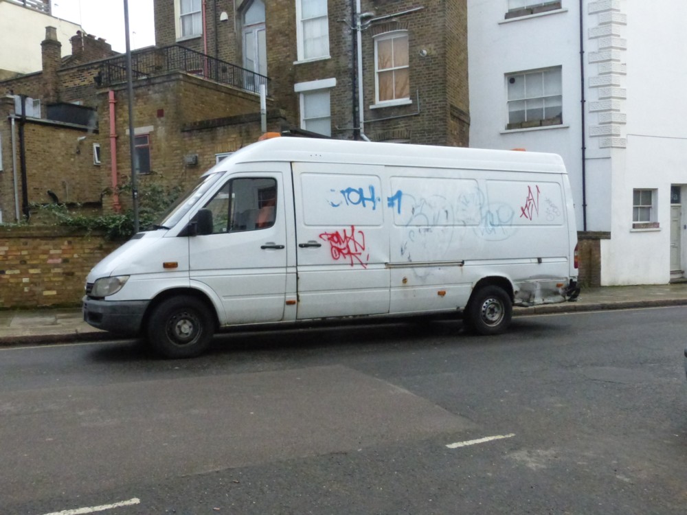 Graffiti, badly covered up or badly cleaned up, and then more graffiti. Not good. I have never seen a white van that was an graffiti battlefield before. Graffighting?