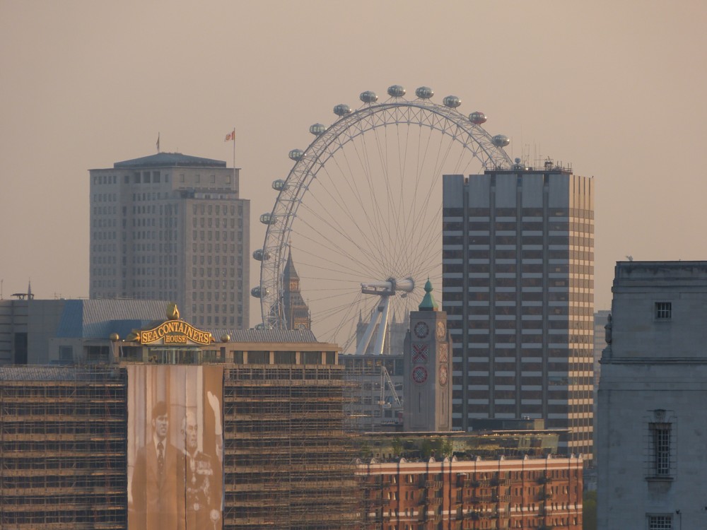 I like it. Big Ben, seen through the Wheel, the Wheel presumably being what I thought I was photoing at the time. Outstanding roof clutter, right next to the Wheel. The pleasingly eccentric Oxo House, slightly nearer to us. Good stuff, albeit rather dimly lit.