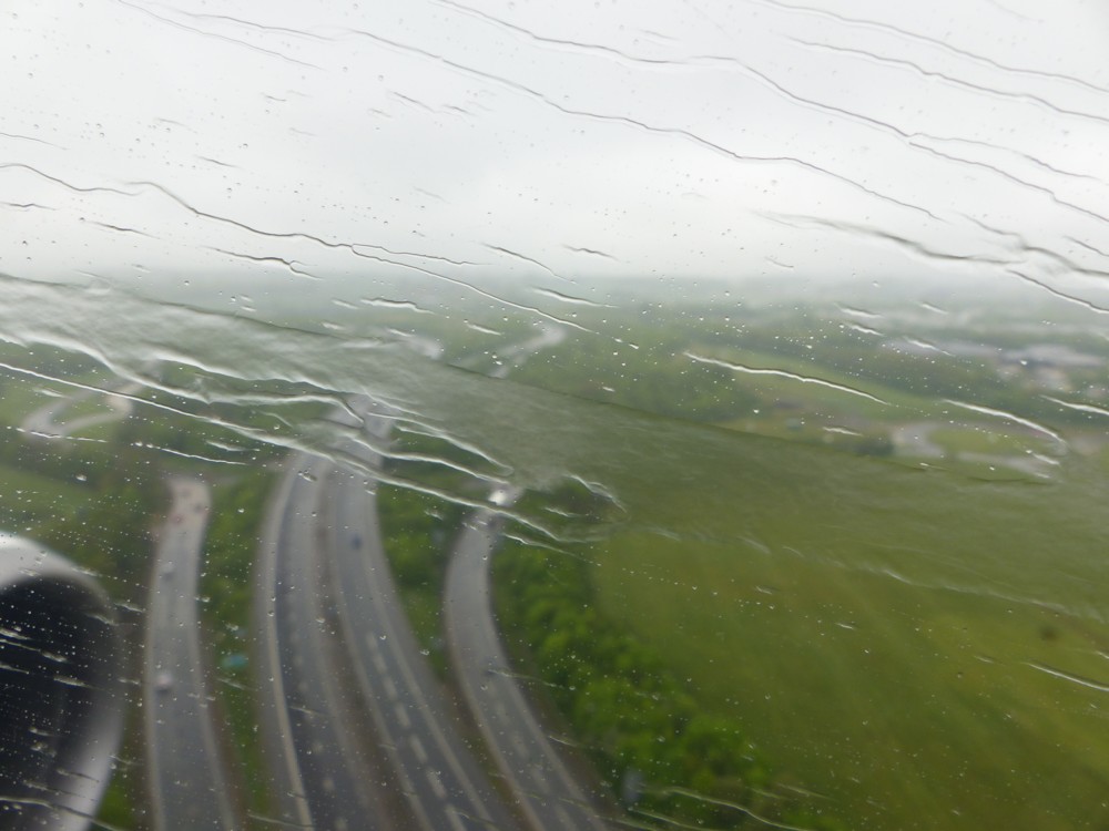 Obviously, being ice, these “cracks” are on the outside of the plane, on the outermost of the three layers of airplane window. Soon after the photo above was taken, the Ryanairplane descended into the clouds over Stansted Airport, at which point I took the photo below. At the time, what interested me was that the water was moving upwards across the window, on account of the airplane descending. But now what it proves is that those “cracks” have now melted: