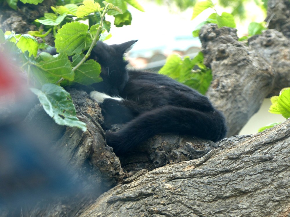 Here is another cat, this time a real one, which we all saw just as we were getting into the car in Thuir to go to Narbonne, to sing in or to just be in the audience for Mozart’s Requiem. I do not often see a cat sleeping in a tree, but this one was: