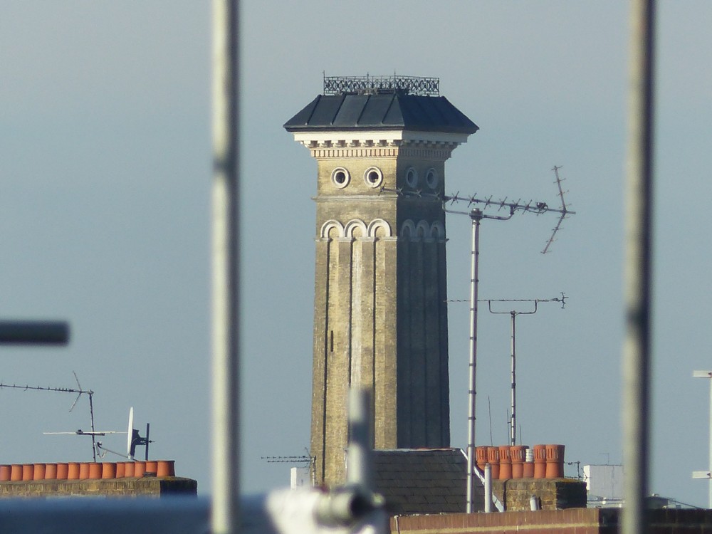 I took this photo from the roof of my block of flats this morning, of a brick tower, out beyond Victoria, with a rather startled expression on its face: