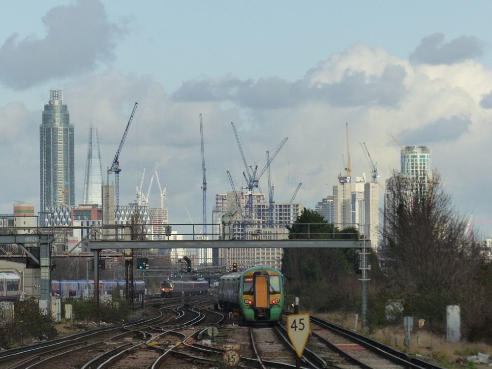Yesterday I was at Clapham Junction. Here is what I photoed when I went to the far northern end of platform 12 (I think it was), further from the river than I usually find myself, and looked back towards London in a northerly direction: