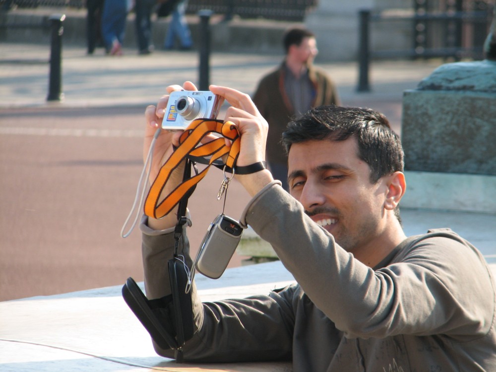 What this guy is holding in his hands is the past (i.e ten years ago) and the future (i.e. today) of low-end digital photography. He is using a now obsolete little digital camera of the kind people hardly use any more, to take his photos, back then on April 2nd 2007. Dangling down below that is a mobile phone, which is what people mostly now use to take these kinds of photos.