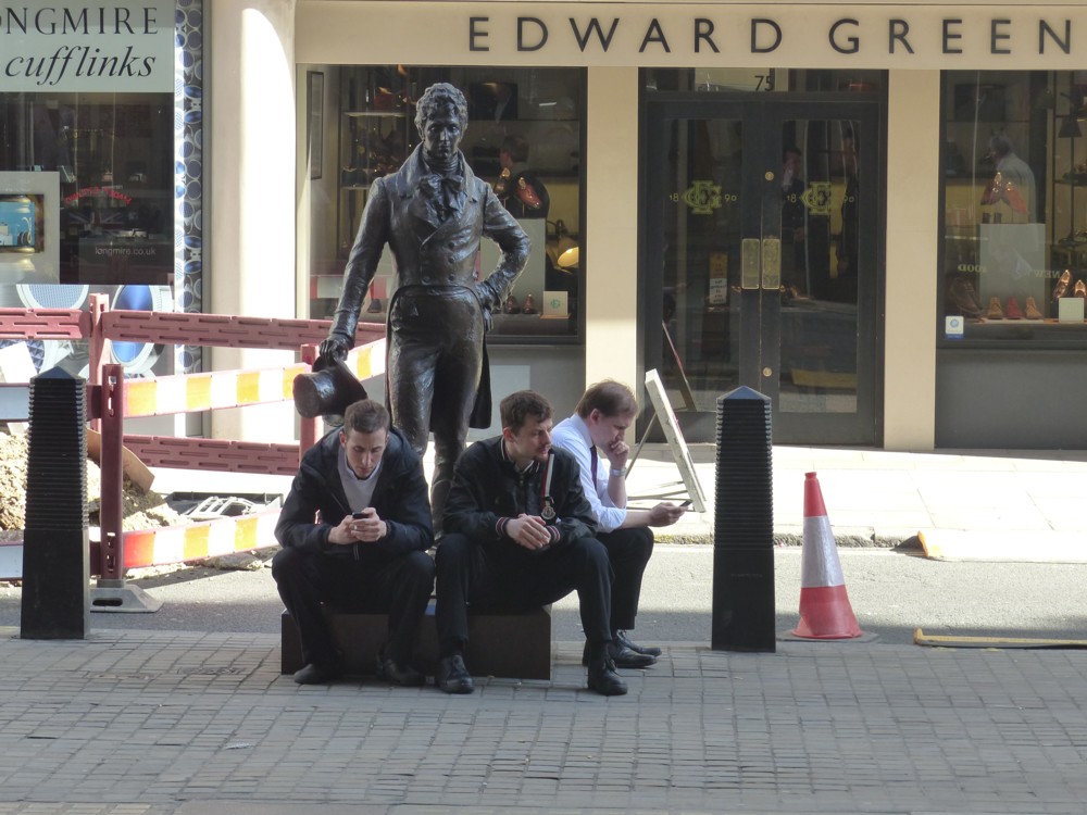 And fourth, I am becoming increasingly interested by London’s many statues, as often as not commemorating the heroes of earlier conflicts. I think one of the things I like about them is the sense of a very particular place that they radiate, just as the more showoffy Big Things do, but even more precisely. They thus facilitate meeting up with people. “In front of the Bank of England” might prove too vague. “Next to Wellington” pins it down far more exactly.