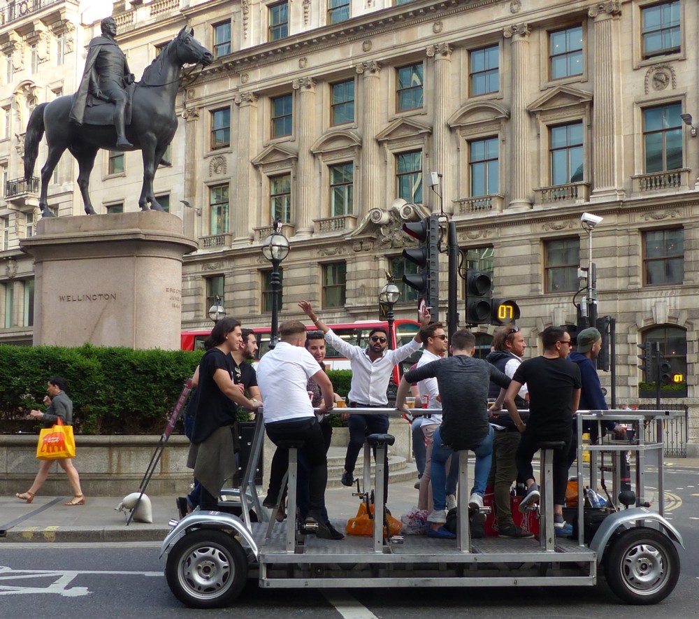 The Wellington statue makes a splendid contrast with the pedi/PedalBussers. Wellington is Wellington, seated on his horse (Copenhagen presumably), very dignified and patrician. And the peddlers are the kind of people he commanded in his battles.