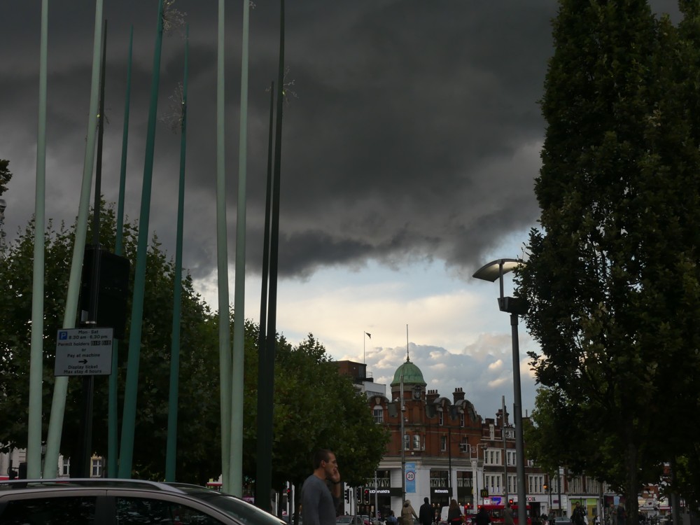 Often, when I show photos here, they were taken days, weeks, months or even years ago. Yesterday, there were photos that were taken ten years ago. Not that there’s anything wrong with that, but: the above photos were taken earlier this evening, when I journeyed out to Brixton Curry’s PC World Carphone Warehouse or whatever the &&&&& it’s called, to try and to fail to buy a new TV. Which means that this is topical meteorological reportage.