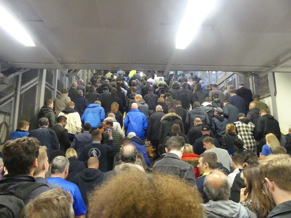 He was not psychic. He was a Chelsea supporter. And so, as he well knew, were most of the other people causing the train to be so strangely packed. Above is my photo of us all waiting to get out from the rather unfortunately named Fulham Broadway tube station, which is right near the Chelsea ground, but not nearly so near to the Fulham ground.