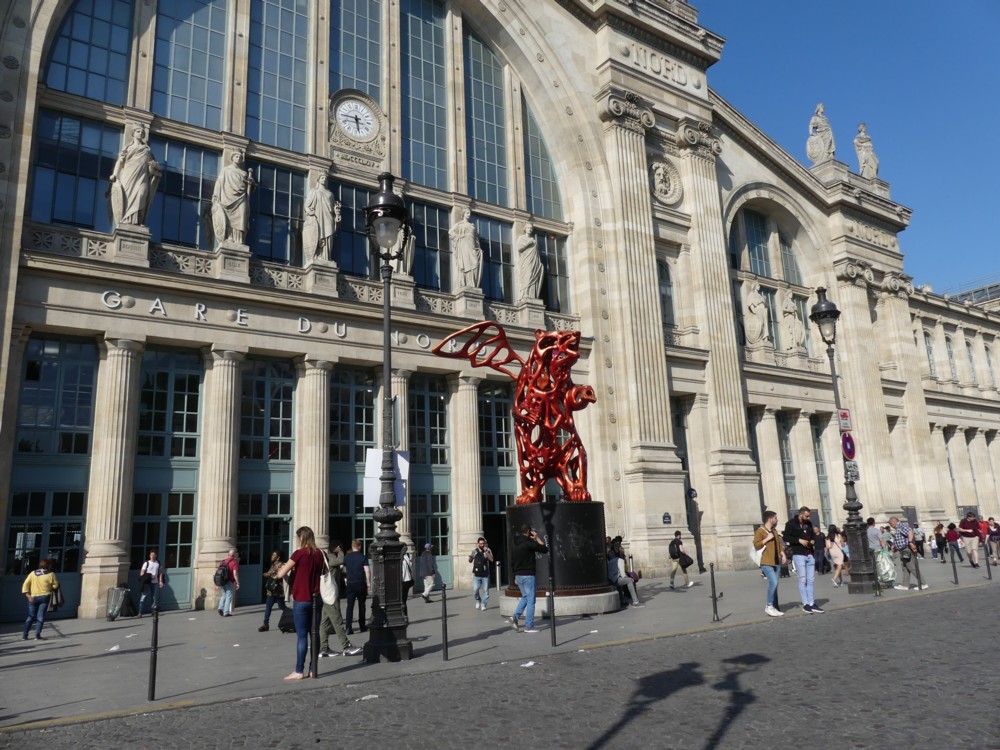 When you go by train to Quimper from London, you start by going by Eurostar to the Gare du Nord in Paris. And when you step outside the main entrance of the Gare du Nord, you find yourself next to a big red bear with wings.