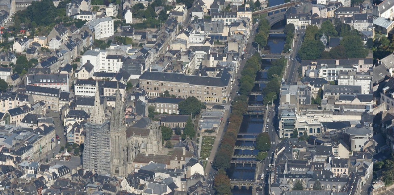 I can tell you from the scaffolding that this photo, even though this is the first time I’ve ever seen it, was probably taken in 2006, because all my Quimper Cathedral photos when I went there in 2006 also had one of the Cathedral towers smothered in scaffolding. That was in September. My guess is that the above aerial photo was taken earlier that summer.