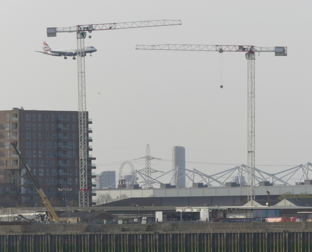 An airplane approaches London City Airport. There are cranes, leaning away from each other, ...